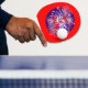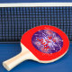 A fun 4th of July pingpong paddle covered with red and white fireworks, deep blue circles on a bright red background.