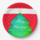 Decorative bright red paper plates with a Merry Christmas theme, the tree, stars, or stripe along with text are removable. The red background can be changed to any colour, and the text can be personalised to your very own message.