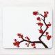 A sakura graphic image with bright red flowers and black trunk on a white mousepad