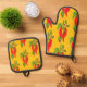 Bright red peppers art on oven mitt. Bold and bright peppers, green leaves with orange background.