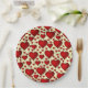 A pattern of bright red romantic hearts, some big some small on a yellow background. Subtle black lines between the hearts give it an interesting looking texture.