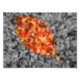 A selectively coloured autumn photograph of fallen crepe myrtle leaves, with a gold-framed leaf shape of bright red, orange, and yellow against a black and white background.