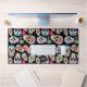 Bright and colourful images of sugar skulls make a fun pattern on this unique desk mat. There are several different skull images, all individual in various colours, and placed on a dramatic black background. Your two letter monogram is in white on a black circle banner at the centre bottom.