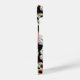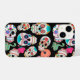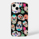 Bright and colorful images of sugar skulls make a fun pattern on this unique phone case. There are several different skull images, all individual in various colors, and placed on a dramatic black background.