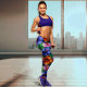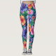 A bold, maximalist tropical floral print with big purple, orange, and pink blooms on a dark blue background covers these vibrant leggings.