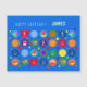 Celebrate your loved ones birthday or special occasion with this bright, colourful and eye catching design. Depicting balloons, stars and cupcakes set upon vibrantly coloured discs and set against a dazzling blue background. Text is in white and can be customised to the age, name and occasion of your choice.