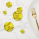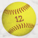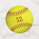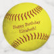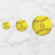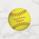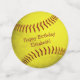 This cute softball birthday party confetti features the realistic image of a softball that has been recolored bright yellow with red stitching on the front and back of each confetti piece, upon which you can customise the text - by katz_d_zynes