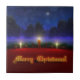 A 3D Christmas scene created in Vue, with candles set on red in front of pine garland accented with red and gold ornaments. In the snowy background are blue-green fir trees against a swirling fractal sky sprinkled with stars. A single sparkling star dominates the night sky. In front of the holiday decorations is a glowing gold Merry Christmas greeting.