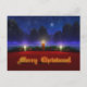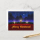 A 3D Christmas scene created in Vue, with candles set on red in front of pine garland accented with red and gold ornaments. In the snowy background are blue-green fir trees against a swirling fractal sky sprinkled with stars. A single sparkling star dominates the night sky. In front of the holiday decorations is a glowing gold Merry Christmas greeting.