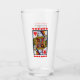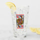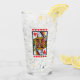 This glass tumbler for beverages has a brightly coloured fancy red heart queen playing card in a black border with a row of vibrant red hearts above and below her on the front and back.