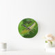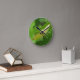 This awesome clock features a detailed macro photograph of a small yellow coloured moth with brown markings perched on a hollyhock leaf. In the photograph you can see the underside of the moths wings, the fur on the top of its back, its bulging eyes and its brown and white legs. You can also see that it has unfurled its feeding tube to test whether or not the hollyhock leaf is food.