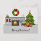 Destei's original cartoon illustration of a cute brindle and white colour Boston Terrier breed dog. The dog is placed in a festive room that has a fireplace and a lot of Christmas decorations including a green Christmas tree, some red stockings and a wreath with a red bow on it. There is also a personalizable text area that now reads: "Merry Christmas!".