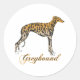 Red brindle greyhound with text "Greyhound" on small round stickers.