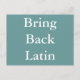 A light teal "Bring Back Latin" postcard. A recent report released in the UK recommended that latin be taught in primary schools. Latin, ancient Greek and Classics in general used to very popular but have declined in recent decades so only a handful of state schools now teach them. Use this sticker to show your support for the campain to bring ancient languages back to British schools!