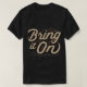 A bold and vibrant t-shirt design featuring the phrase "Bring It On!" in a dynamic, multi-coloured layout. The design conveys a sense of confidence, energy, and a readiness to face challenges. Perfect for those who embrace a positive and assertive attitude.
