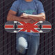 This mini skateboard is decorated with a British flag design! Makes a terrific United Kingdom souveinr gift and a great gift for skaters!