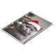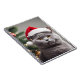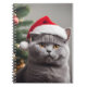 Cute blue/grey British shorthair cat wearing a Santa hat.
