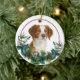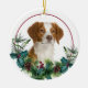 On the front of this Holiday ornament is a beautiful portrait of a red and white Brittany dog peeking out of a holly and evergreen bough. Red berries and pine cones decorate the holly and pine sprigs. The image is placed on a white circle within a thin red line circle. The back of the ornament has the same evergreen bough wreath and circle with your custom text in red.