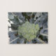 This awesome puzzle features a detailed photograph of a head of broccoli growing in a garden. The tightly bunched green florets are surrounded by the large outer leaves of the vegetable.