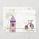 Broken homes postcard by artist John Allen. the house is colourful on the outside but underneath lies a bard wire with a back flower and empty tricycle.