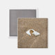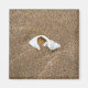 A close up photograph of a broken shell on a sandy beach printed on a square fridge magnet.