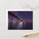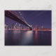 This beautiful postcard features a night time shot of New York's city skyline in the background with the Brooklyn Bridge in the foreground.