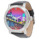 Watch in a digital painting of the New York City skyline, featuring the Brooklyn Bridge at nightfall, in vivid shades of blue and deep fuchsia pink