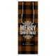 Custom printed personalised holiday gift bags. This modern rustic design features distressed white Merry Christmas typography on a black and cognac brown buffalo check background. Personalise it with your business name or other custom text in a vintage typewriter font. Use the design tools to choose any background colour, edit the text fonts and colours, or upload your own photos to create personalised Christmas wine gift bags for simple and stylish gift wrapping.