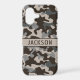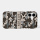 Customize this brown and gray camouflage iPhone 17 case with your name in a trendy modern CAP font in brown on taupe. It's masculine and perfect for your favorite military, hunting, country or outdoorsman!