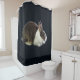 A brown and white Dutch rabbit, historically known as Hollander or Brabander, is shown with its ears upright against a dark background, highlighting its soft fur and attentive expression. The composition emphasises the contrast between the rabbit's light and dark fur.