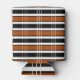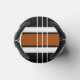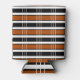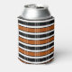 This can cooler has a geometric design of a plaid with brown and white lines on a black background.