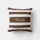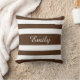 A stylish and unique throw pillow cushion with a brown and white striped pattern design and a customisable white name print on the front side.