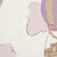 Sketched nursery wallpaper design with brown bears in hot air balloons floating in the sky in front of a rainbow, with a bright, colorful, girly color palette filled with shades of purple, pink, peach, brown, and beige over an off-white wallpaper background.