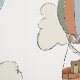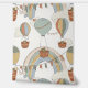 Sketched nursery wallpaper design with brown bears in hot air balloons floating in the sky in front of a rainbow, with greens, creams, yellows, and blues over a white background.