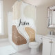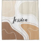 Personalized shower curtain featuring a modern abstract geometrical shapes pattern in neutral colors of brown and beige and a personalized name print in the center.