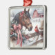Farming themed Christmas ornament with a pretty brown horse with a red bow and a pretty red cardinal on the fence with a rustic barn in the background of a snowy winter day watercolor ai art.