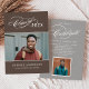 Celebrate your graduate with this elegant graduation party invitation featuring a flourished "Class of" calligraphy script with the year on a rich brown background alongside a senior portrait framed by thin line accents. The grey back features a beautiful "Celebrate" script headline with a second photo spot and all your party details. Fully customisable text on both sides.