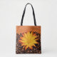 Tote bag with a photograph of a lot of coffee beans and a yellow daisy tinted with orange on a wooden background.