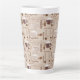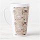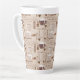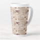 Enjoy your favorite coffee in this latte mug featuring pattern of coffee cups and terms in brown and white on a beige background. Makes a great gift for the coffee lover in your life.
