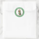 An image of an adorable brown Dachshund dog wearing a green winter sweater, red and white striped scarf, and hat is at the centre of this Holiday sticker. The image is framed in a circular green border which contains your custom text in white. Cute for Christmas cards, correspondence, and gift packages.