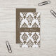 This elegant business card is perfect for any business or store. It features a white background with a brown damask pattern on the top and bottom of the front. A brown stripe runs through the centre. The back is a solid brown. All text is customisable.