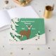 This guestbook for your events and parties has a brown female doe deer with a white face standing next to a tall pine tree in the snow on a mint green background. Customise your name, event and dates with the templates.