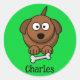 Brown dog with bone personalised on green classic round sticker