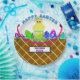 Whimisical diagonal brown lines Easter basket with pink and green Easter grass and pink handle. Happy Easter typography in sky blue. Cute yellow chick hatched from yellow blue striped egg with decorated eggs. Name typography in purple inside black and white rectangle. Original Artwork Design © TamiraZDesigns.