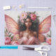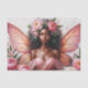 This tissue paper features an enchanting painting of a pretty black girl fairy. The dark-skinned fae girl is has delicate, translucent wings in shades of pink, orange, and gold. She wears an elegant, flowing dress of soft, layered fabrics in blush tones, perfectly complementing her radiant dark brown complexion. A beautiful floral crown made of large, lush peonies and greenery rests atop her thick curly hair, adding a whimsical, natural charm. Surrounded by blooming flowers, the young, melanated fairy exudes grace and serenity. Her serene expression enhances the magical, ethereal atmosphere of the artwork. This fantasy-inspired feminine portrait blends elements of nature, beauty, and fairy tale wonder.