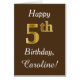 This simple birthday card design features the message "Happy 5th Birthday", with the "5th" having a faux gold-like appearance. It also features a customised name, and a brown background. It could be given to somebody who is celebrating their fifth birthday.