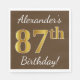 This simple paper napkin design features a message like "Alexander’s 87th Birthday!", with the "87th" having a faux gold-like appearance, on a brown coloured background. The name can be customised. It could be used at a birthday party for somebody who is celebrating their eighty seventh birthday. [~Z0000082]