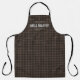 Custom kitchen apron feature classic dark brown and black gingham check with light grey personalised text of grill master and name . Great personalised bbq apron for men.