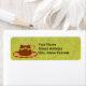 Customise this return address label featuring a whimsy brown and gold steaming coffee cup on a lime green textured background with your return address or other information. This label can also be used as a label for boxes, books, and more. This art is from fabric designer Phyllis Dobbs and is one of several designs in this store. These coffee art designs will delight coffee lovers or baristas. There are multiple images in this collection and they all blend together on the products. Fully customisable.
