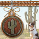 Unique and cute brown western style leather pet tag featuring a green stitched leather cactus that is all the rage for cowboys, cowgirls and country folk everywhere. Not only is this tag a hit around the arena, but city folk that are into the southwest scene will also love this pet ornament.